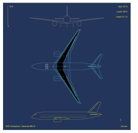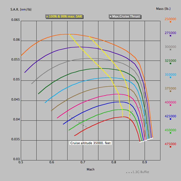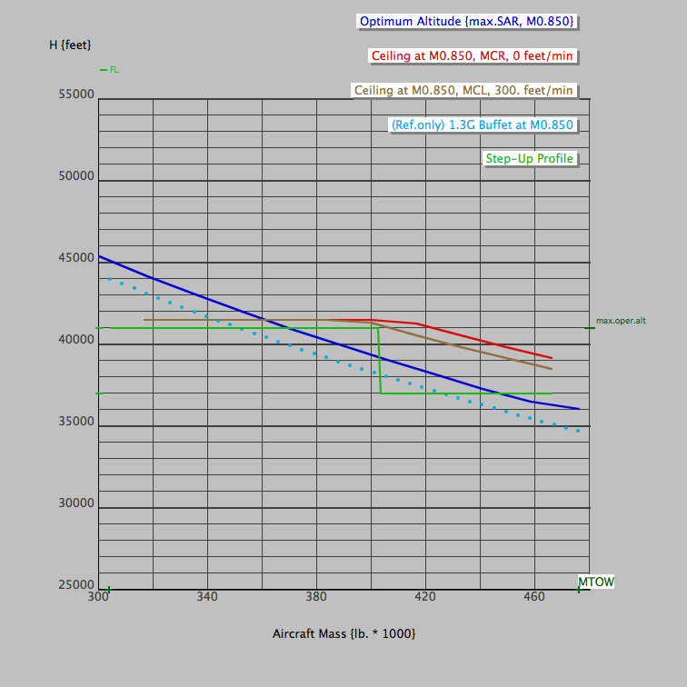Engine ratings are not yet finalised, and various options may be offered. The generic engine used here has a Boeing equivalent thrust (BET) of 63800 lbf (66540 lbf SLST), and assumes emissions of -30% NOx, -50% HC and +10% CO for a GEnx-64B relative to CF6-80C2B levels. Max climb and cruise ratings are set comparatively high, to provide a good ICA capability. Detailed mission profile calculations can be found at the end of this page.