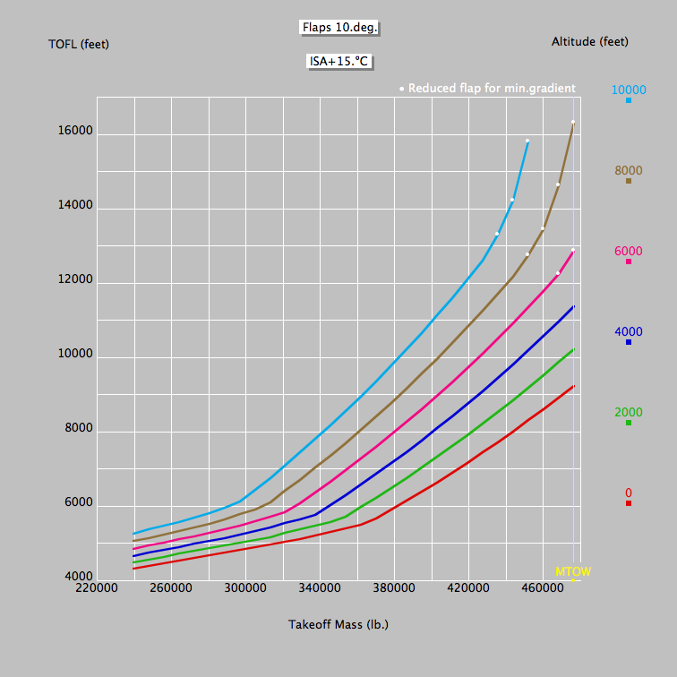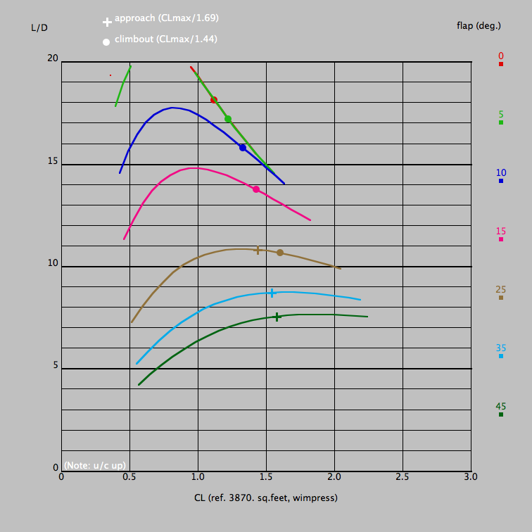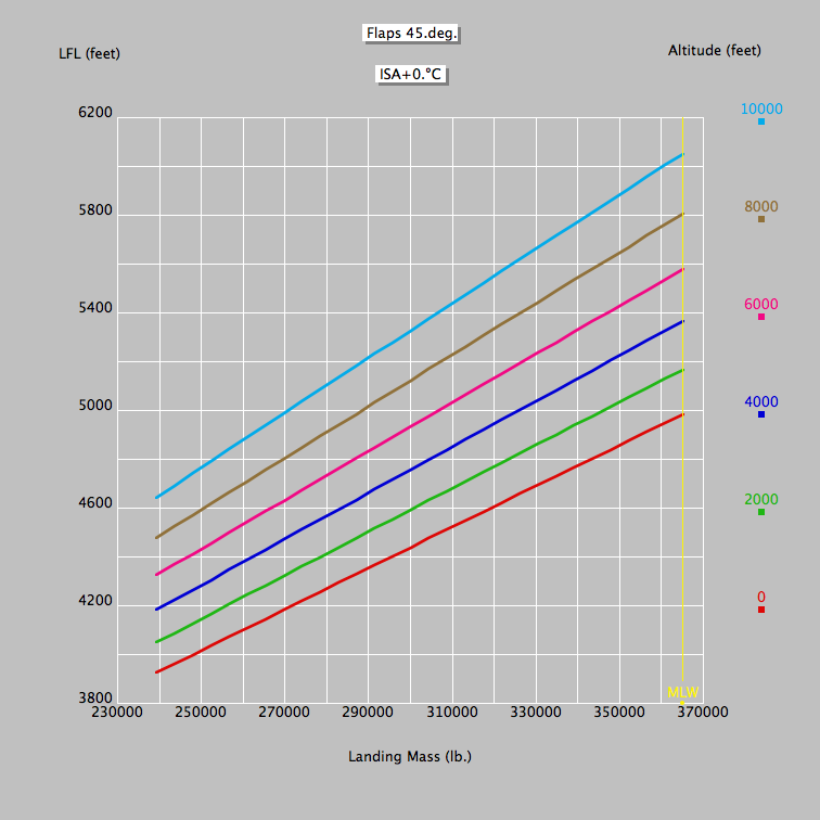 TAKEOFF PERFORMANCE {476000.lb., altitude 0.feet, ISA+15.deg.C.} ___________________ JAR25 Takeoff Field Length 9255. feet 115% Factored All-Eng.Dist. 8785. feet Balanced Field Length 9255. feet 2nd Segment Climb Gradient 3.49 % Takeoff CLmax 1.91 {wimpress ref.area} Takeoff Vstall 138. keas Takeoff Vmc 132. keas Takeoff Vfail 157. keas Takeoff V2 165. keas L/D at 2nd segment 14.15 {incl.windmill & asymm.} Takeoff Wing Loading 136. p.s.f.{trap.W/S} Takeoff Thrust/Weight 0.280 available static LANDING PERFORMANCE {365000.lb., altitude 0.feet, ISA+0.deg.C.} ___________________ JAR25 Landing Field Length 4986. feet Landing Distance (LFL*0.6) 2992. feet Landing Ground Roll 2037. feet Landing CLmax 2.66 {wimpress ref.area} Landing Vstall 102. keas Approach Speed 133. keas Approach L/D 6.96 {gear down}