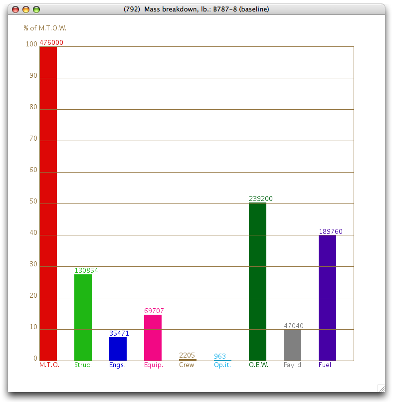 Gross design weights conform to values published by Boeing (Sept. 2005), implying significant savings from the use of composites. Adjustments needed in Piano to match these quotes would indicate a challenging task, of the order of -15% on overall structural mass compared to all-metal construction. Historically, weight increases happen regularly during project development. We'll all have to wait and see.