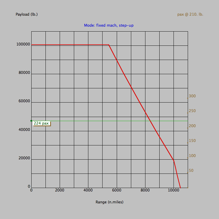 Boeing recently revised the 787 brochure to show a baseline payload of 242 pax over a range of roughly 7860 nm and simultaneously removed their OEW claim. Piano indicates that an increase in OEW to approximately 243500 lb will account for the revised payload-range characteristics (these include Boeing's minor adjustment in fuel capacity). Using a typical value of furnishings-per-pax, the weight increase is largely (but not totally) explained by the extra seating. The data quoted below remain valid at the original OEW (239200 lb, 224 pax configuration). You may choose to reduce all payloads by the difference in OEW depending on an individual airline's delivery specs.June 21st 2006: More changes have been made to the 787 brochure. Boeing appears ready to revert to generic ZFW-range charts (as opposed to payload-range). This would sidestep the need to claim a specific OEW linked to a specific configuration.