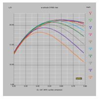 AERODYNAMIC DRAG REPORT at: --------------------------- MACH 0.850 Altitude (pressure) 37000. feet KTAS 487.5 KEAS 260.0 KCAS 277.9 Reynolds number 1.873 millions per foot Delta-ISA +0. deg.C. CL 0.508 based on: Reference Area 3870.00 sq.feet (wimpress) Drag Coefficients based on ref.area ----------------------------------- Cd Zero-Lift 0.01277 (52.4 %) Cd Lift-Induced 0.01022 (41.9 %) Cd Compressibility 0.00071 ( 2.9 %) Cd Trim 0.00069 ( 2.8 %) Delta Cd (polar-mod) 0.00000 ( 0.0 %) ------- -------- Cd Total 0.02439 ( 100 %) Aerodynamic Boundaries: ----------------------- Divergence Mach 0.864 {at the given CL 0.508} Initial Buffet Mach 0.875 {at the given CL 0.508} Initial Buffet CL 0.624 {at the given Mach 0.850} Zero-Lift Component Breakdown (Drag Areas,= Cd*S = D/q) ----------------------------- Wing 18.313 sq.feet (37.0 %) Winglets 0.143 sq.feet ( 0.3 %) Fuselage & fairing 19.367 sq.feet (39.2 %) Stabiliser 4.049 sq.feet ( 8.2 %) Fin 2.975 sq.feet ( 6.0 %) Nacelles (total) 4.591 sq.feet ( 9.3 %) User CdS Increment 0.000 sq.feet ( 0.0 %) ------- -------- Total Cd0*S 49.438 sq.feet ( 100 %) Overall Lift / Drag Ratio = 20.84 ================================= Total Lift Force 450002. lbf. Total Drag Force 21598. lbf. (10799.lbf. per engine) Engine / Airframe Performance: ------------------------------ Total Fuel Flow at Thrust=Drag: 11402. lb/hr Specific Fuel Consumption (SFC) 0.5279 lb/hr/lbf Specific Air Range (SAR) 0.0428 nm/lb Emissions Index, NOx 11.88 g/kg. Available Total Thrust at MCR: 25521. lbf. Available Total Thrust at MCL: 27449. lbf. Instantaneous Performance Reserves at Weight=Lift: RoC at MCR, constant Mach 0.850: 429. feet/min RoC at MCR, constant 278.KCAS: 300. feet/min RoC at MCL, constant Mach 0.850: 640. feet/min RoC at MCL, constant 278.KCAS: 447. feet/min Drag Tabulation @ 37000.feet, Ref.Area 3870.00 sq.feet (wimpress) ------------------------------------------------------------------------------ Mach CL Cd{0} Cd{lift} Cd{comp} Cd{trim} Cd{mod} Cd{tot} L/D 0.800 0.400 0.01299 0.00645 0.00002 0.00065 +0.00000 0.02011 19.90 0.800 0.450 0.01299 0.00812 0.00002 0.00068 +0.00000 0.02179 20.65 0.800 0.500 0.01299 0.00997 0.00002 0.00069 +0.00000 0.02366 21.13 0.800 0.550 0.01299 0.01200 0.00002 0.00071 +0.00000 0.02571 21.39 0.800 0.600 0.01299 0.01421 0.00005 0.00071 +0.00000 0.02796 21.46 0.800 0.650 0.01299 0.01660 0.00008 0.00071 +0.00000 0.03038 21.40 0.820 0.400 0.01291 0.00643 0.00004 0.00065 +0.00000 0.02003 19.97 0.820 0.450 0.01291 0.00810 0.00007 0.00067 +0.00000 0.02175 20.69 0.820 0.500 0.01291 0.00994 0.00010 0.00069 +0.00000 0.02364 21.15 0.820 0.550 0.01291 0.01197 0.00014 0.00070 +0.00000 0.02572 21.38 0.820 0.600 0.01291 0.01418 0.00020 0.00071 +0.00000 0.02800 21.43 0.820 0.650 0.01291 0.01657 0.00029 0.00071 +0.00000 0.03048 21.33 0.850 0.400 0.01279 0.00640 0.00029 0.00065 +0.00000 0.02013 19.87 0.850 0.450 0.01279 0.00806 0.00042 0.00067 +0.00000 0.02194 20.51 0.850 0.500 0.01279 0.00990 0.00065 0.00069 +0.00000 0.02404 20.80 0.850 0.550 0.01279 0.01192 0.00104 0.00070 +0.00000 0.02646 20.78 0.850 0.600 0.01279 0.01413 0.00167 0.00071 +0.00000 0.02930 20.48 0.850 0.650 0.01279 0.01651 0.00264 0.00071 +0.00000 0.03264 19.91 0.870 0.400 0.01272 0.00636 0.00111 0.00064 +0.00000 0.02083 19.20 0.870 0.450 0.01272 0.00801 0.00174 0.00067 +0.00000 0.02313 19.45 0.870 0.500 0.01272 0.00985 0.00270 0.00069 +0.00000 0.02595 19.27 0.870 0.550 0.01272 0.01187 0.00413 0.00070 +0.00000 0.02941 18.70 0.870 0.600 0.01272 0.01406 0.00617 0.00070 +0.00000 0.03365 17.83 0.870 0.650 0.01272 0.01644 0.00901 0.00070 +0.00000 0.03887 16.72