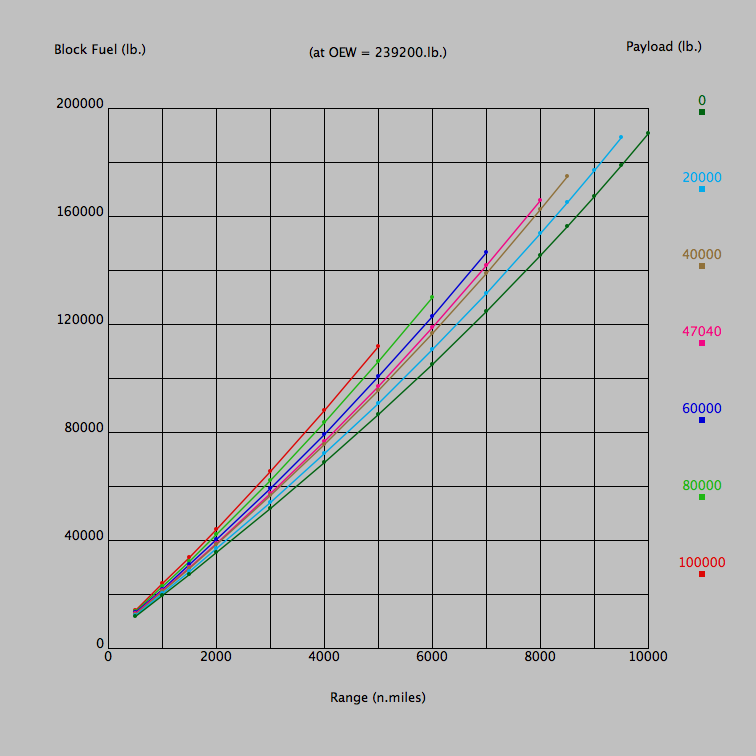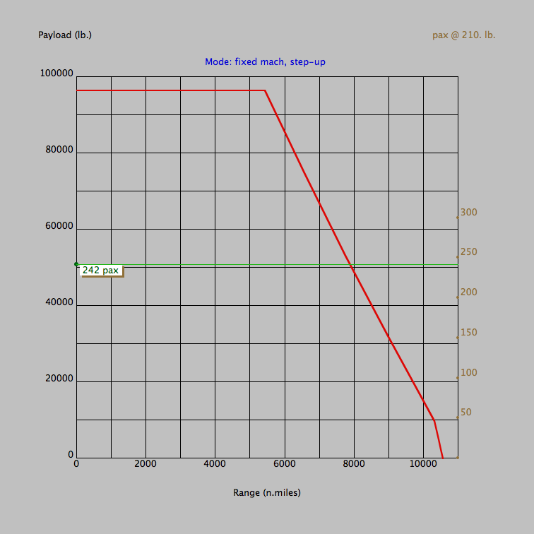 Boeing recently revised the 787 brochure to show a baseline payload of 242 pax over a range of roughly 7860 nm and simultaneously removed their OEW claim. Piano indicates that an increase in OEW to approximately 243500 lb will account for the revised payload-range characteristics (these include Boeing's minor adjustment in fuel capacity). Using a typical value of furnishings-per-pax, the weight increase is largely (but not totally) explained by the extra seating. The data quoted below remain valid at the original OEW (239200 lb, 224 pax configuration). You may choose to reduce all payloads by the difference in OEW depending on an individual airline's delivery specs.June 21st 2006: More changes have been made to the 787 brochure. Boeing appears ready to revert to generic ZFW-range charts (as opposed to payload-range). This would sidestep the need to claim a specific OEW linked to a specific configuration.