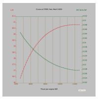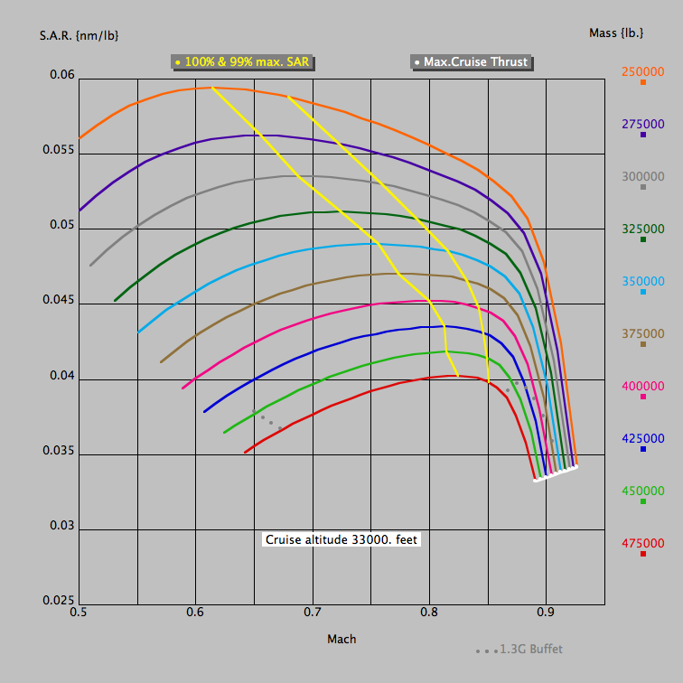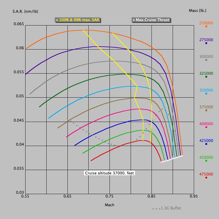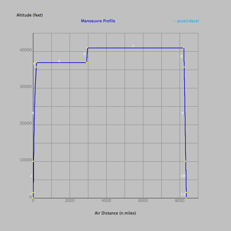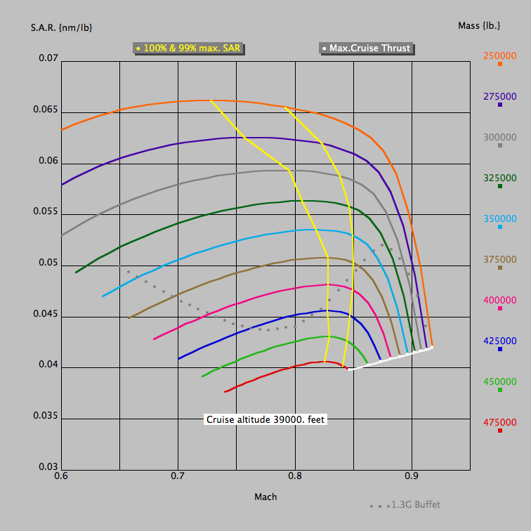 Engine ratings are not yet finalised, and various options may be offered. The generic engine used here has a Boeing equivalent thrust (BET) of 63800 lbf (66540 lbf SLST), and assumes emissions of -30% NOx, -50% HC and +10% CO for a GEnx-64B relative to CF6-80C2B levels. Max climb and cruise ratings are set comparatively high, to provide a good ICA capability. Detailed mission profile calculations can be found at the end of this page.