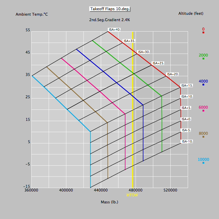 TAKEOFF PERFORMANCE {476000.lb., altitude 0.feet, ISA+15.deg.C.} ___________________ JAR25 Takeoff Field Length 9255. feet 115% Factored All-Eng.Dist. 8785. feet Balanced Field Length 9255. feet 2nd Segment Climb Gradient 3.49 % Takeoff CLmax 1.91 {wimpress ref.area} Takeoff Vstall 138. keas Takeoff Vmc 132. keas Takeoff Vfail 157. keas Takeoff V2 165. keas L/D at 2nd segment 14.15 {incl.windmill & asymm.} Takeoff Wing Loading 136. p.s.f.{trap.W/S} Takeoff Thrust/Weight 0.280 available static LANDING PERFORMANCE {365000.lb., altitude 0.feet, ISA+0.deg.C.} ___________________ JAR25 Landing Field Length 4986. feet Landing Distance (LFL*0.6) 2992. feet Landing Ground Roll 2037. feet Landing CLmax 2.66 {wimpress ref.area} Landing Vstall 102. keas Approach Speed 133. keas Approach L/D 6.96 {gear down}