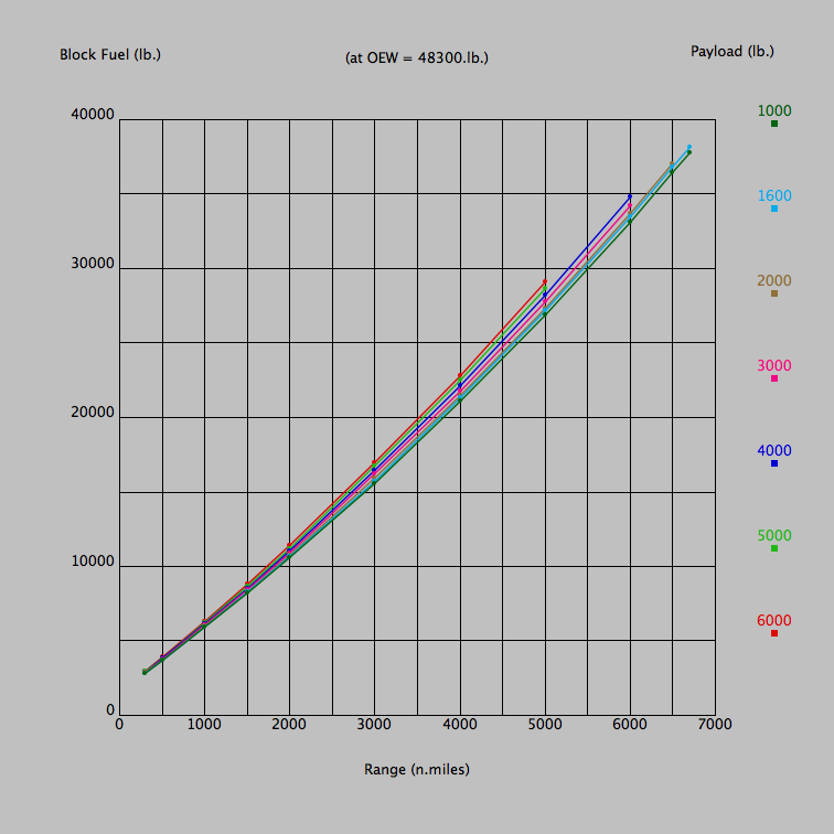 Calculating design range...done. RANGE REPORT {design} ____________ {TOW 90799.lb./ OEW 48300.lb./ Fuel 40899.lb./ Payload 1600.lb.} Range mode: fixed mach, step-up cruise Climb schedule: 250./ 277.kcas/ mach 0.797 above 34040.feet Cruise at Mach = 0.800 {FL 410 450 490 510} ICA 41000.feet, 459.ktas, 237.kcas, CL=0.46, 2400.lbf./eng=MCR-14% FCA 51000.feet, 459.ktas, 187.kcas, CL=0.45, 1519.lbf./eng=MCR-10% Distance Time Fuelburn (n.miles) (min.) (lb.) _________ ______ _______ Climb 144. 22. 2373. {S.L to ICA} Cruise 6504. 850. 35085. {ICA to ICA} Descent 101. 17. 230. {ICA to S.L} _________ ______ _______ Trip total 6748. 889. 37687. Block total ========= 908. 38486. Emissions: taxi,t/o climb cruise descent app,taxi total (lb.NOx) 4.9 34.3 269.5 0.9 1.5 311.0 (lb.HC) 0.23 0.07 3.36 0.38 0.13 4.18 (lb.CO) 6.7 4.0 260.0 9.5 3.8 284.1 Manoeuvre allowances: taxi-out 400. lb. {extra to t/o mass} 10.0 min. takeoff 159. lb. 1.0 min. approach 138. lb. 2.5 min. taxi-in 102. lb. {taken from reserves} 5.0 min. Reserves {at landing mass 52814.lb.}: Diversion distance 200. n.miles Diversion mach 0.548 Diversion altitude 30959. feet Diversion fuel 1578. lb. Holding time 30. minutes Holding mach 0.217 Holding altitude 5000. feet Holding fuel 1336. lb. Contingency fuel 0. lb. {0.% of mission fuel} Total Reserve fuel 2914. lb.